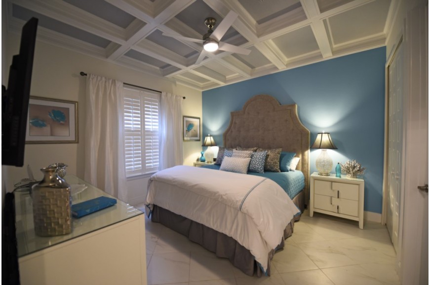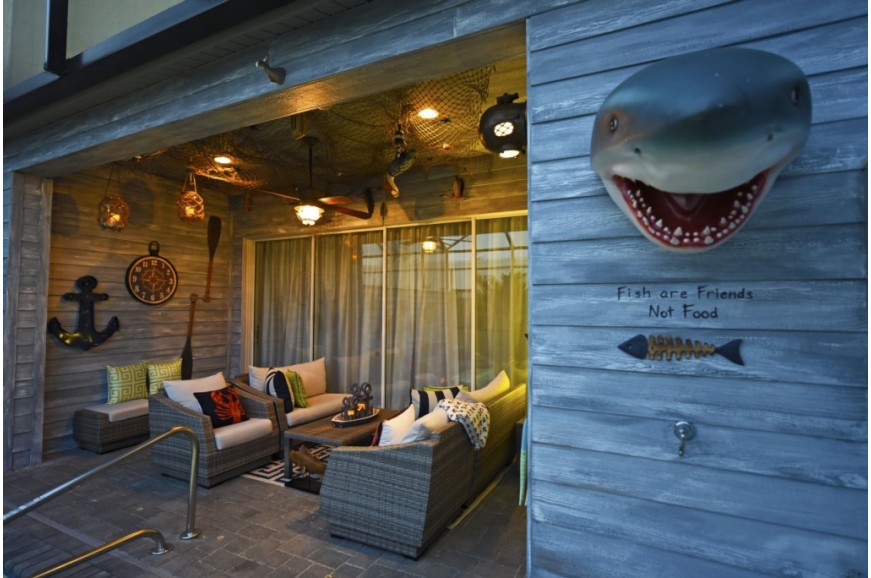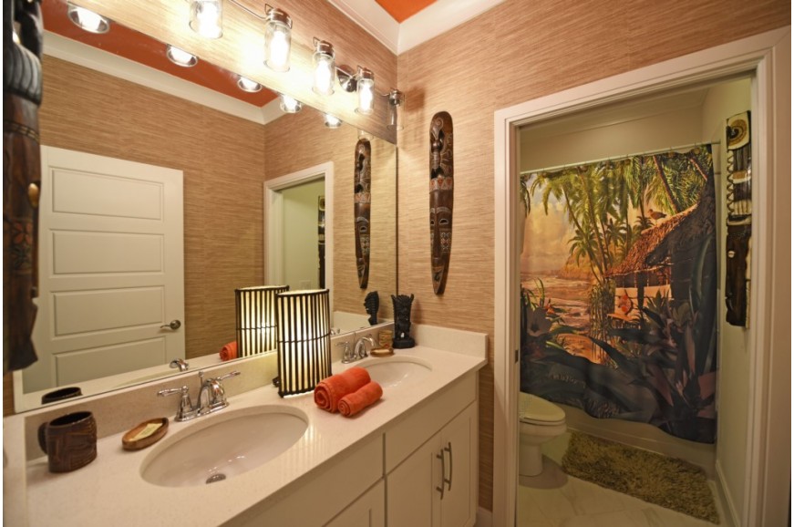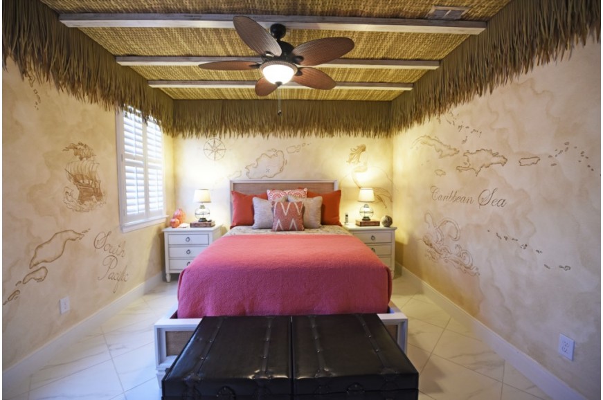 The villa’s relaxing master bedroom, featuring a coffered ceiling, creates a feeling of peace and serenity. Located on the main floor, it is just the place for you to escape. Let the whimsical, sepia-toned map in the Polynesian-inspired bedroom, lead the way as you drift off into your dreams. Located on the second floor, this bedroom is suitable for both kids and adults. The adventure doesn’t end there; the bathrooms are wallpapered and decorated to keep the magic alive throughout your stay.