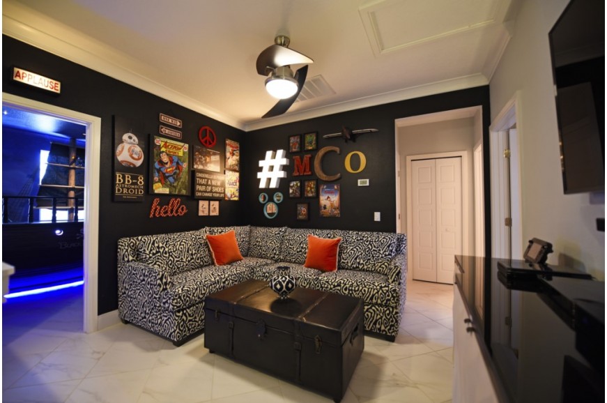 Avast Ye Mateys…. A dream-themed, hand-painted, pirate room can be found in this luxurious townhome which comfortably accommodates a larger family or group of up to 9 people. Girls and boys of all ages will enjoy this custom pirate ship bedroom! The elaborate props and extensive, hand-painted artwork ignites your imagination. No attention to detail has been spared in this professionally appointed residence. You will enjoy stylish, fun, and sophisticated styling throughout this townhome with soaring ceilings and gleaming tiled floors.