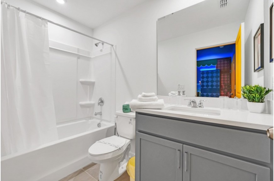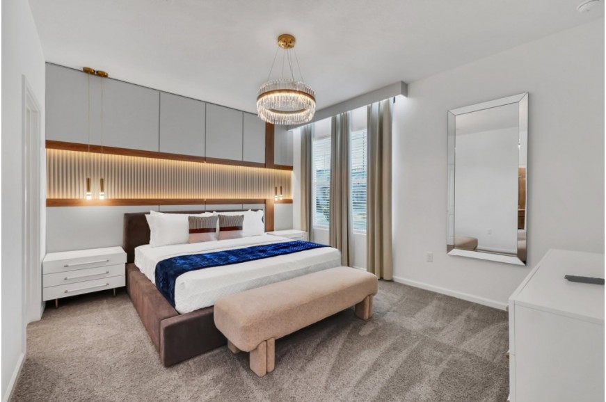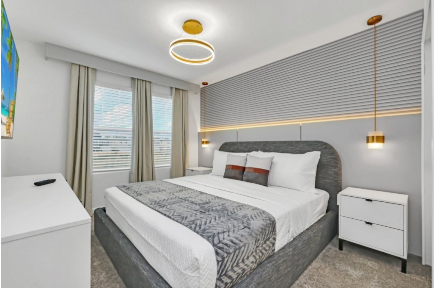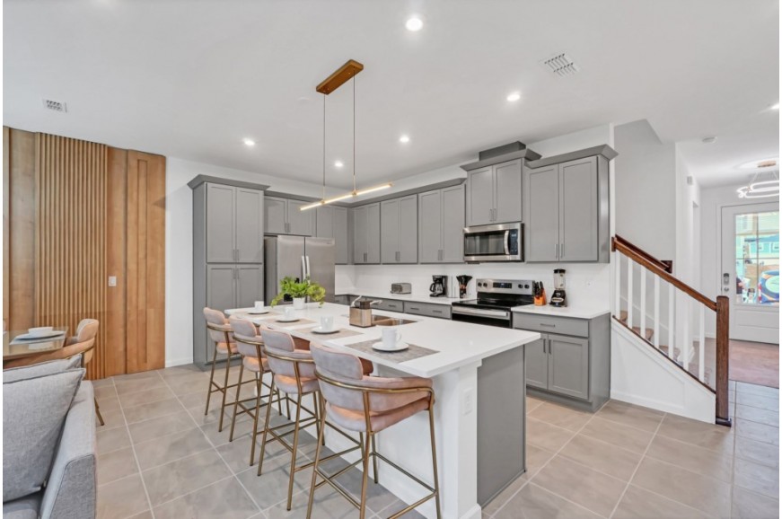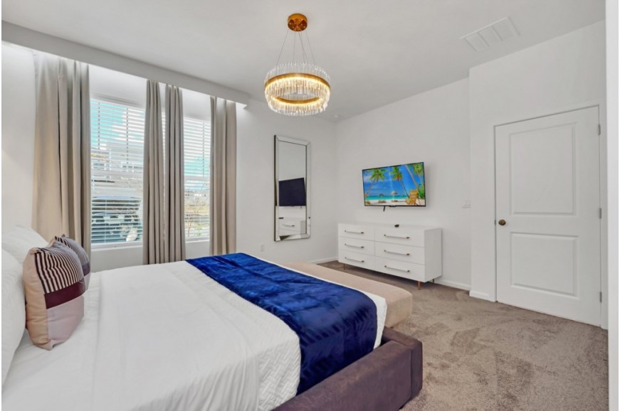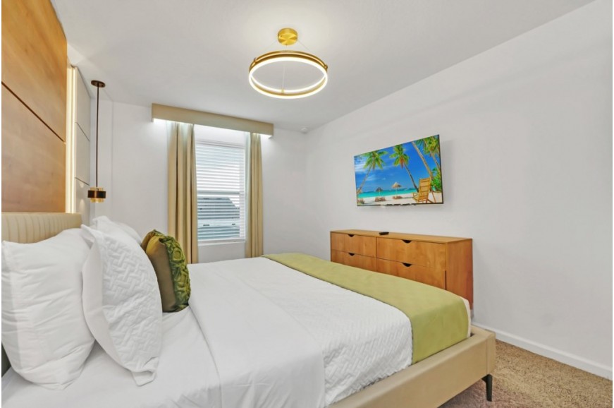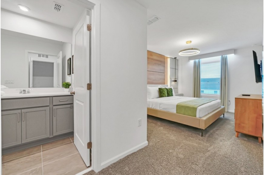 Solara Resort - Kissimmee, Florida is an upscale community currently under development just 7 miles from Walt Disney World. This gated resort community sits nestled just outside of Orlando, Florida. During your stay, you will enjoy this well-appointed townhome that has been designed and decorated to provide you and your family an abundance of luxury amenities and leaves you well equipped to vacation with all the usual items you would expect to find at home. The resort is only a 30-minute drive from the Orlando International Airport and is situated central to all of Orlando’s famous attractions. The resort boasts an expansive clubhouse that includes a grand pool, complete with a surfing simulator, cabanas, pool bar, children's playground, sand volleyball court, basketball court, and soccer field. Inside the clubhouse sits the lounge, bar & grill, fitness center, business center, and sundries store. This spacious 5 bedroom holiday townhome can comfortably accommodate a larger family or group of up to 10 people.