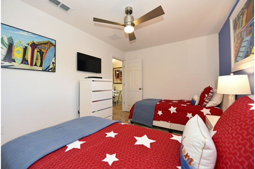 This spacious 6 bedroom holiday villa boasts a pool with spa, air hockey table in the front living room, private bedrooms, and flat-screen cable TVs throughout. It can comfortably accommodate a larger family or group of up to 12 people.